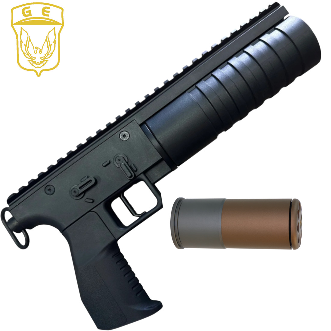 Bring a real-world tactical tool to your skirmish kit — the Golden Eagle BLITZ Grenade Launcher (AT-GLG-02) is a compact, single-shot 40 mm quick-eject grenade launcher, in pistol style format, designed for high-fidelity scenario play and lightweight field use. Built around a polymer chassis with a robust metal Picatinny top rail and pistol-style grip, the BLITZ offers fast, intuitive operation: load a single 40 mm gel ball, grenade, fire, then use the quick-eject mechanism to clear the spent round and reload rapidly. Obviously, quick reloads are based on having more that one grenaxde shell. Ambidextrous controls and an ergonomically ribbed foretube give secure handling in fast engagements, while the top rail accepts optics or red-dot sights for improved aiming. Ideal as a stand-alone novelty sidearm or as an under-barrel style close-support tool in themed events, the BLITZ balances realistic look and simple, safe functionality for organised gel-blaster play. For the best performance, we guggest always using the Golden Eagle BLITZ gel grenades and follow local laws and field rules; always wear eye protection and keep muzzle direction safe at all times.