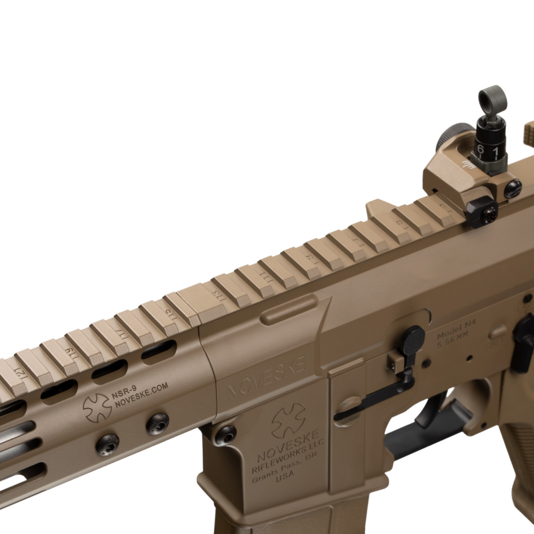 The Noveske N4 Tan AEG Gel Blaster Assault Rifle (SKU: 867) combines authentic Noveske styling with dependable electric operation, now supplied with a factory-fitted Noveske NSR 9 M-LOK handguard for enhanced modularity and ergonomics. Built from reinforced polymer with alloy reinforcements, the N4 delivers consistent AEG performance with a rugged tactical tan finish that suits both CQB and field play.