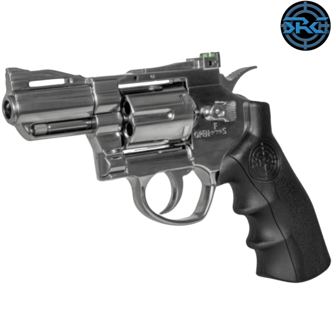 Drum release fulfils at the same time the role of safety, blocking the trigger and hammer from firing an accidental shot. Inside the pistol grip is room for a standard, 12 g CO2 capsule. In order to open the grip and install the capsule, no tools are necessary. Aiming is made easier by luminescent points on the revolver’s rear sight.