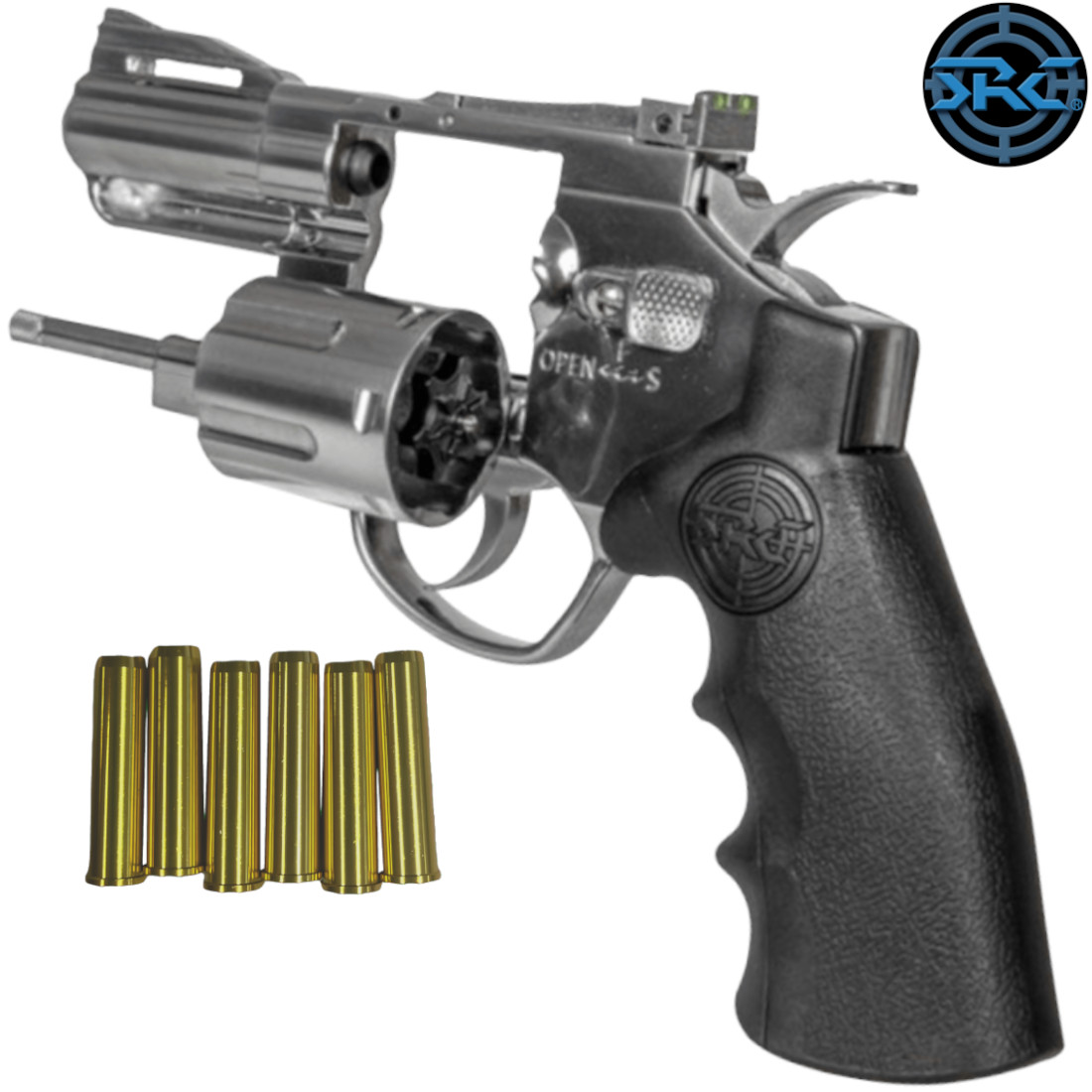 A solid revolver by SRC made almost entirely of metal. Elements of the mechanism such as the hammer, trigger or the drum are also made of metal. The only polymer part is the pistol grip. The gel blaster has a realistic mock shell-feeding system into the rotary drum – exactly as in the case of a live revolver. Each shell carries a single gel. The set includes 6 shells and a dedicated speed loader that enables with a single motion place 6 shells in the drum.
