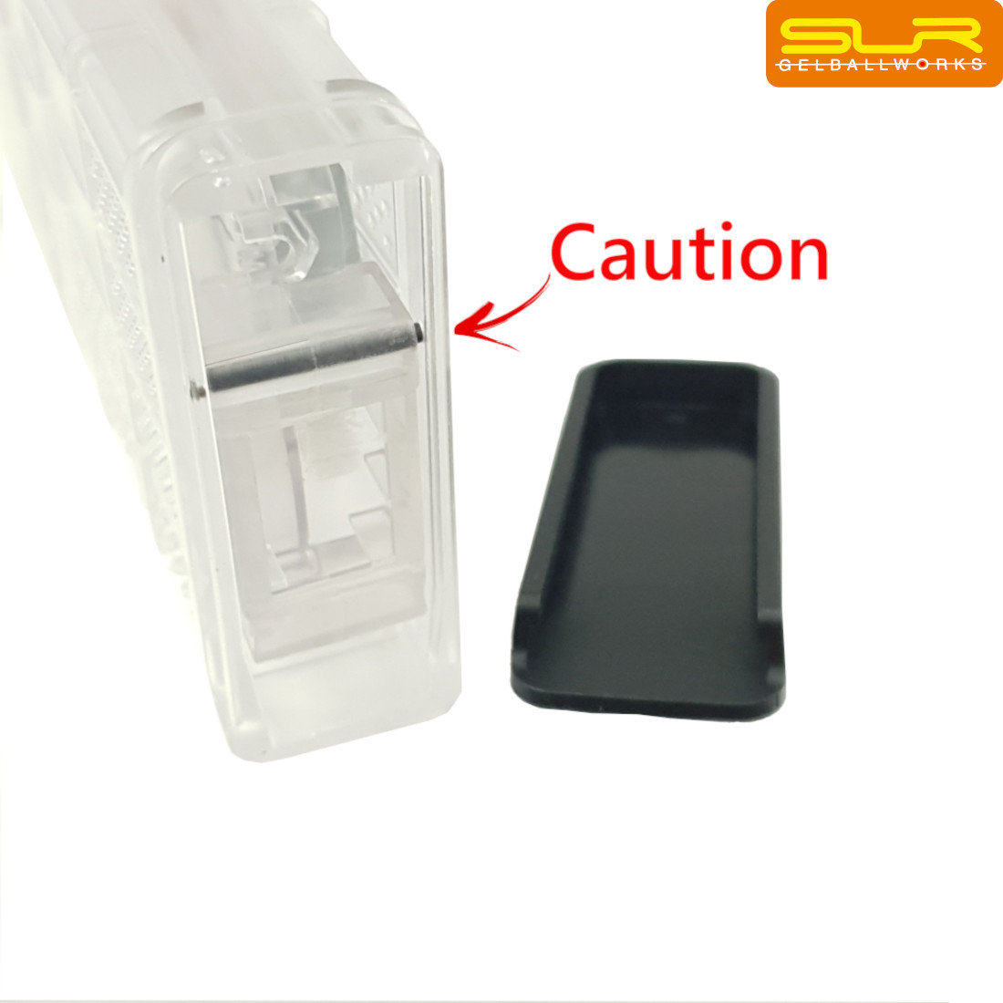 Special Note: The base plate slides off these mags really easily, and the small metal pin that secures the whole mechanism into the magazine, falls out in an instant. See the image that points to the pins, with the word “Caution” next to it. Please take special care not to lose this pin, and possibly think about securing it in place with some sort of adhesive.