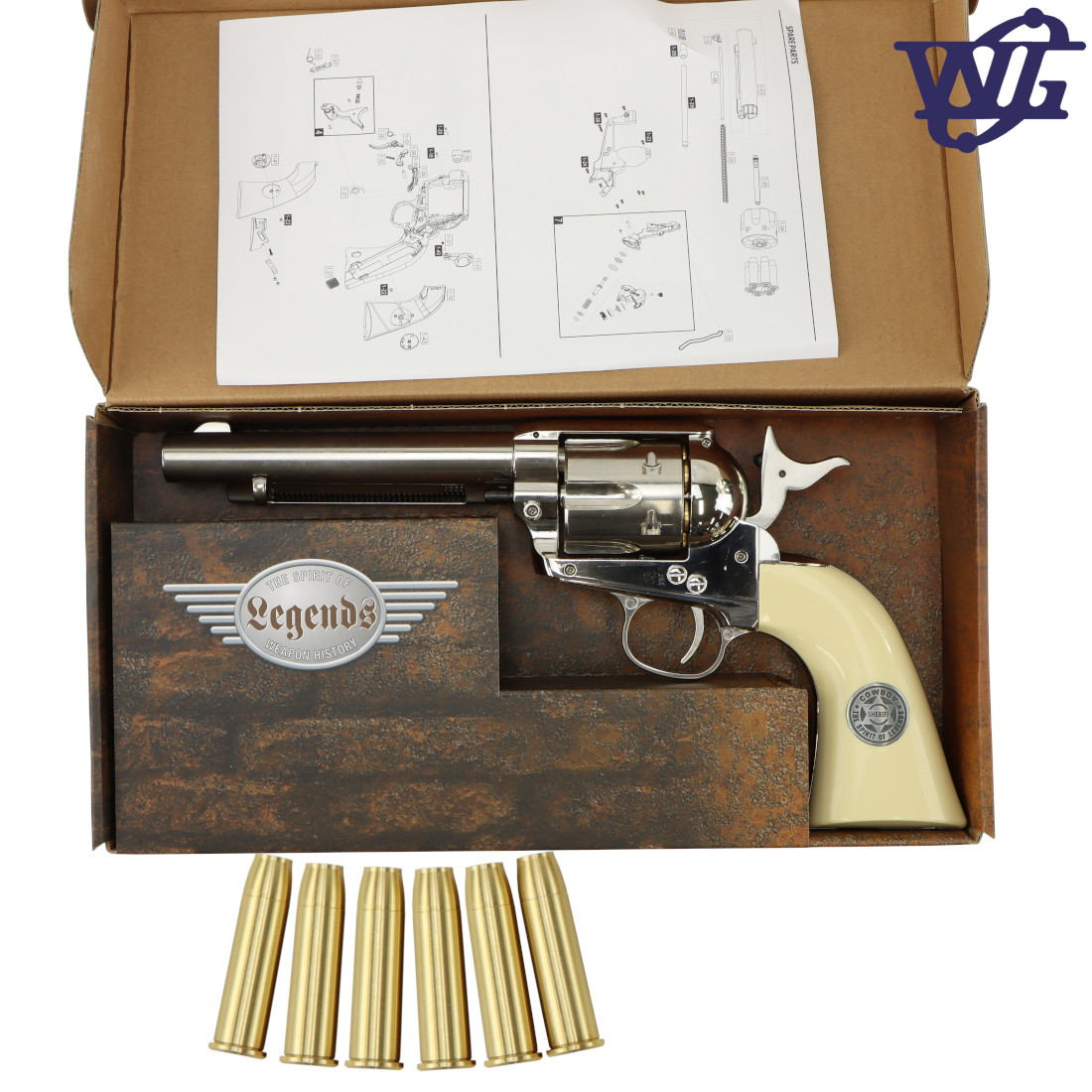 Step into classic Western style with the Wingun Umarex Nickel-Pearl Colt SAA Peacemaker .45 Revolver Gel Blaster — a premium CO₂-powered, single-action gel-ball replica that brings both collector appeal and skirmish functionality. The full-metal body features a polished Nickel/steel finish with a pearl-style grip variant that enhances the look of the iconic Peacemaker silhouette. Equipped with a six-shell cartridge system and housed CO₂ in the grip, it fires 7-8 mm gel balls with performance reported at 300 + FPS.