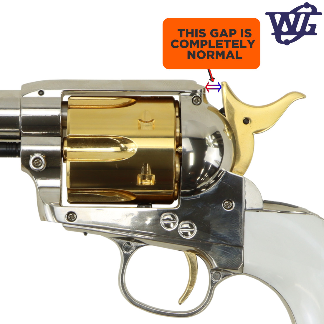 Please note: The gap between the hammer and the body of the revolver is completely normal, and is not a defect. The hammer is held slightly away from tyhe body of the revolver, by the gas release valve’s spring pressure. If you push the hammer, so that it is flush with the back of the revolver body, then gas will escape through the valve.