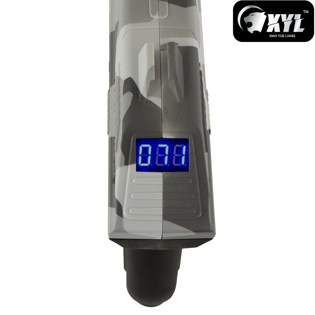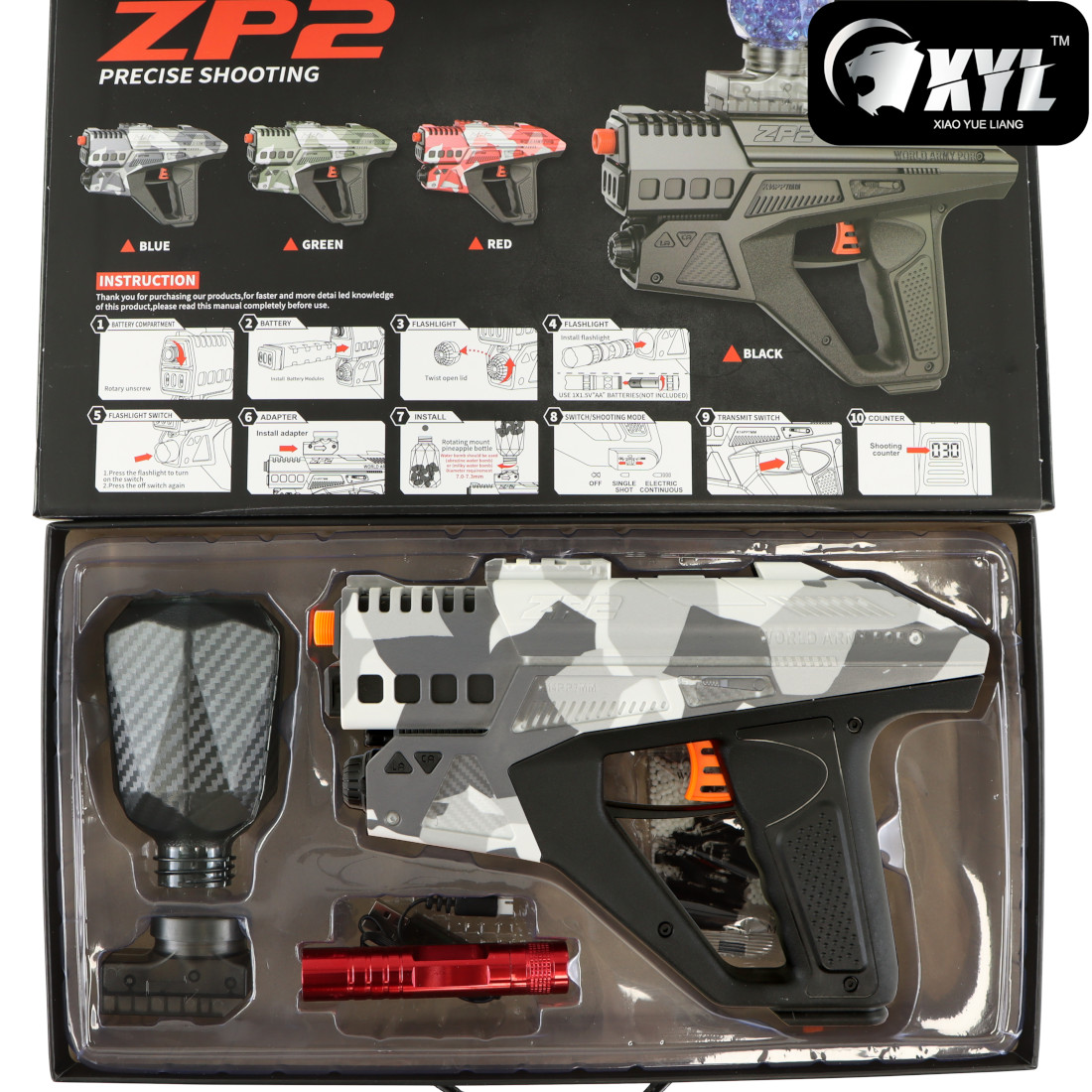 The ZP2’s compact frame and ergonomic grip make it comfortable to use for extended sessions, while its clean Grey Camo finish enhances the futuristic aesthetic. Whether you’re plinking targets in the backyard, introducing new players to gel blasting, or adding a unique sidearm to your collection, the XYL ZP2 offers a fun, accessible, and visually distinctive experience. Another super cool feature is the included tactical torch, which can be mounted into the front of the blaster. Simply remove the dome-shaped blanking cap, and push the torch in. Once in place, push the end of the torch to turn it on, then push it again to turn it off (1 x AA battery required, not included)